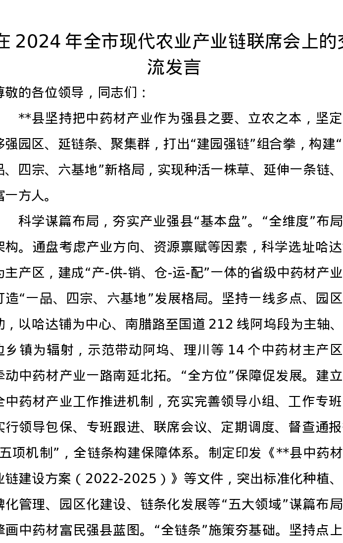 在2024年全市现代农业产业链联席会上的交流发言