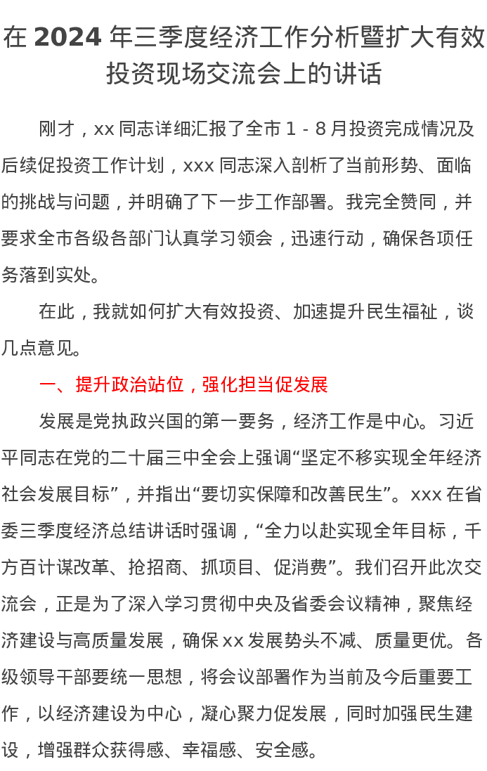 在2024年三季度经济工作分析暨扩大有效投资现场交流会上的讲话