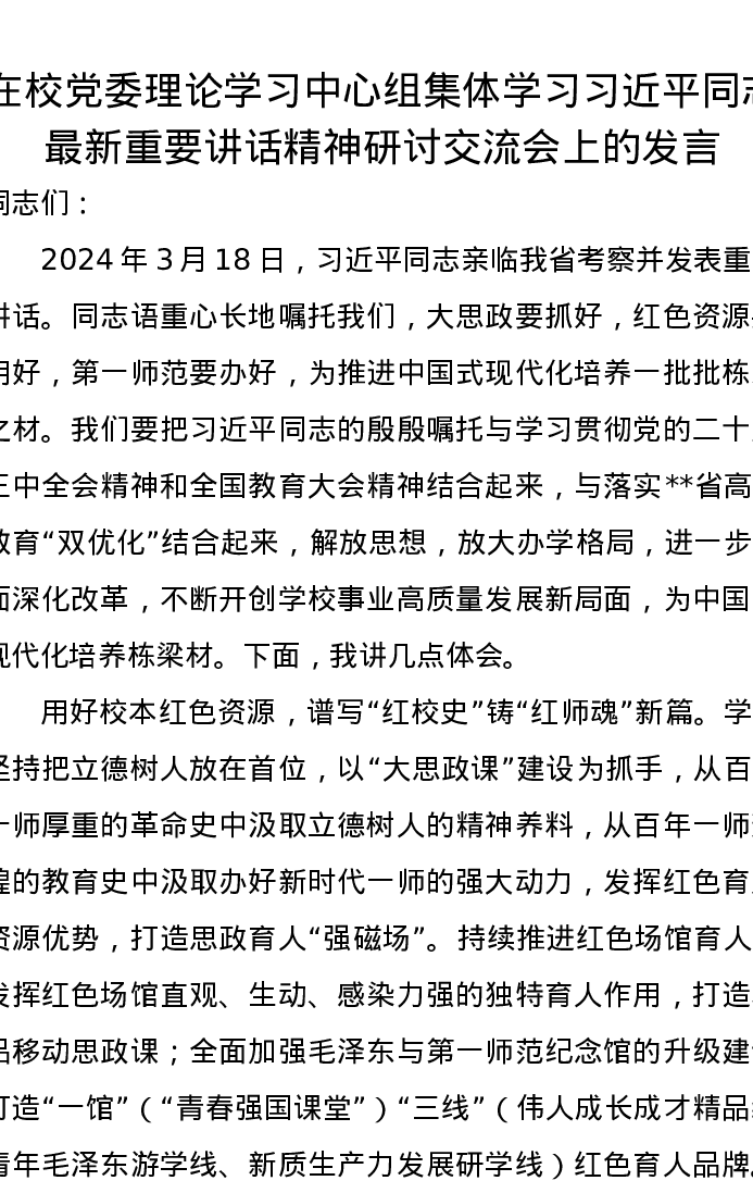 在校党委理论学习中心组集体学习习近平同志最新重要讲话精神研讨交流会上的发言