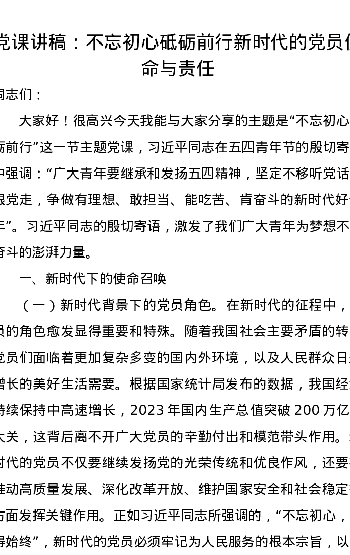 党课讲稿:不忘初心砥砺前行新时代的党员使命与责任