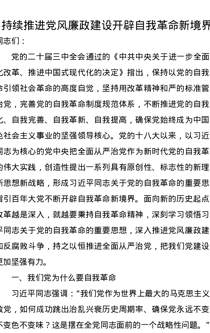 党课讲稿:持续推进党风廉政建设,开辟自我革命新境界