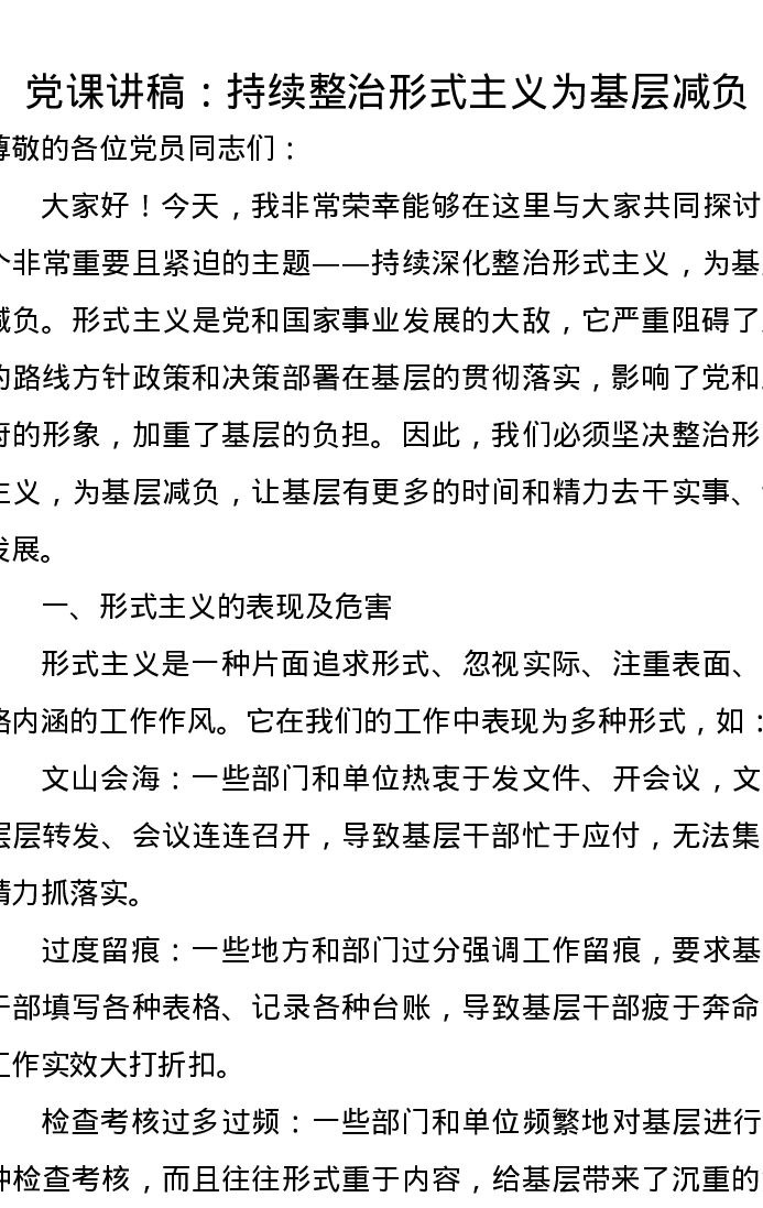 党课讲稿:持续整治形式主义为基层减负