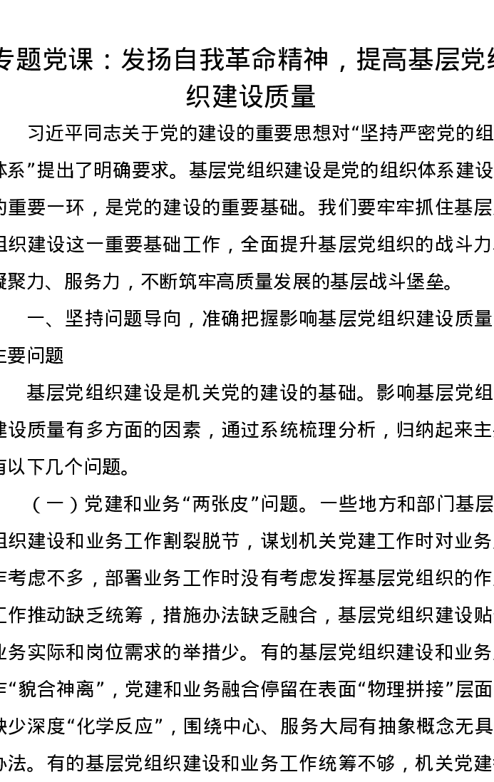 党课讲稿:发扬自我革命精神,提高基层党组织建设质量