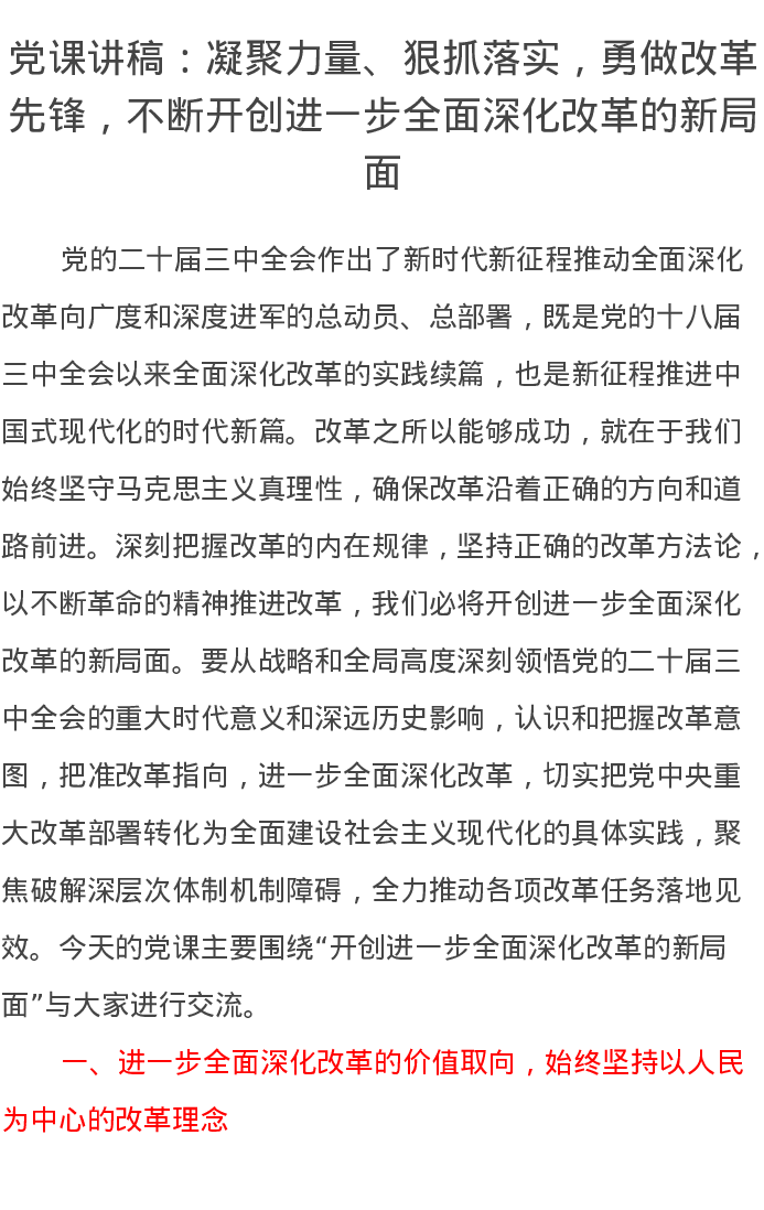 党课讲稿:凝聚力量、狠抓落实,勇做改革先锋,不断开创进一步全面深化改革的新局面