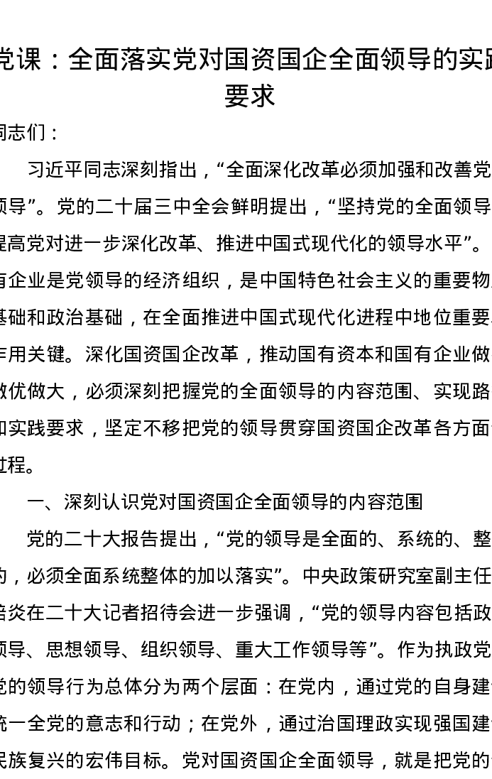党课讲稿:全面落实党对国资国企全面领导的实践要求
