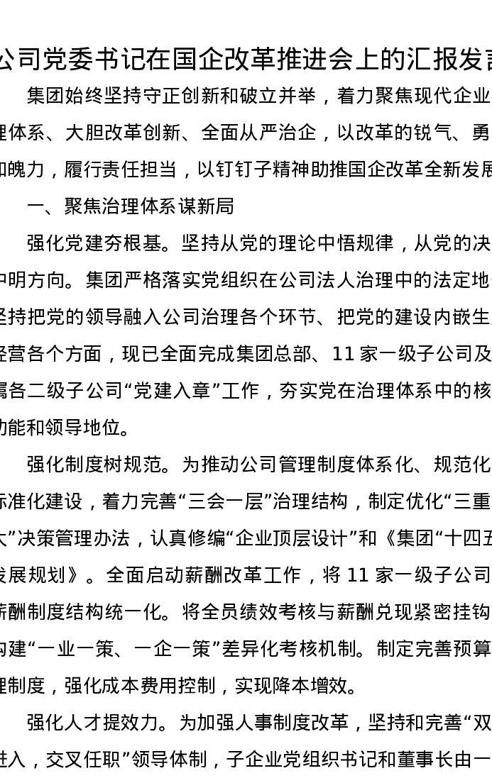 公司党委书记在国企改革推进会上的汇报发言