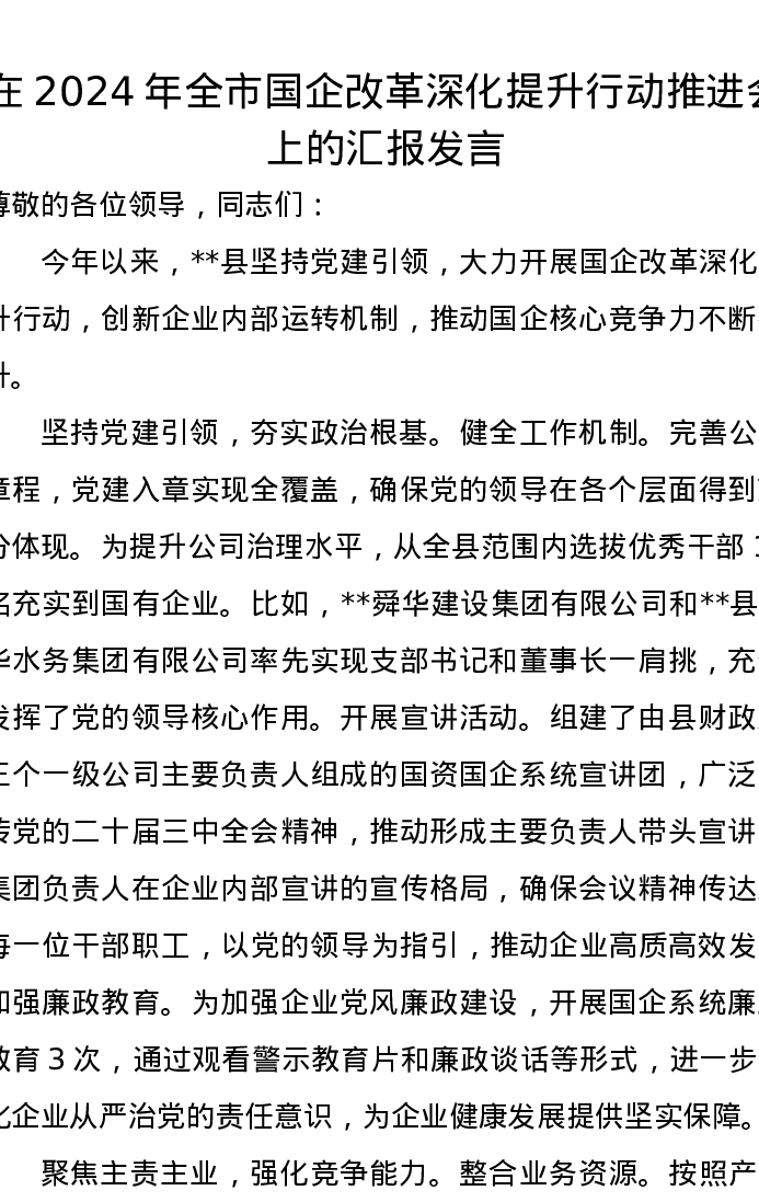 在2024年全市国企改革深化提升行动推进会上的汇报发言