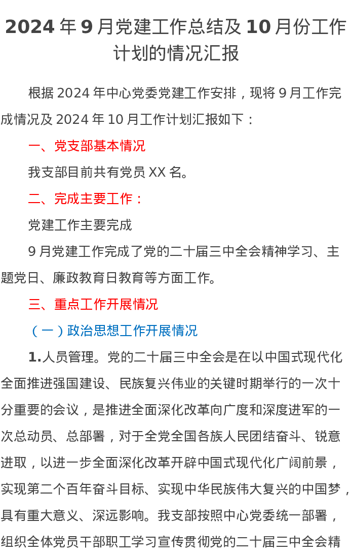 2024年9月党建工作总结及10月份工作计划的情况汇报