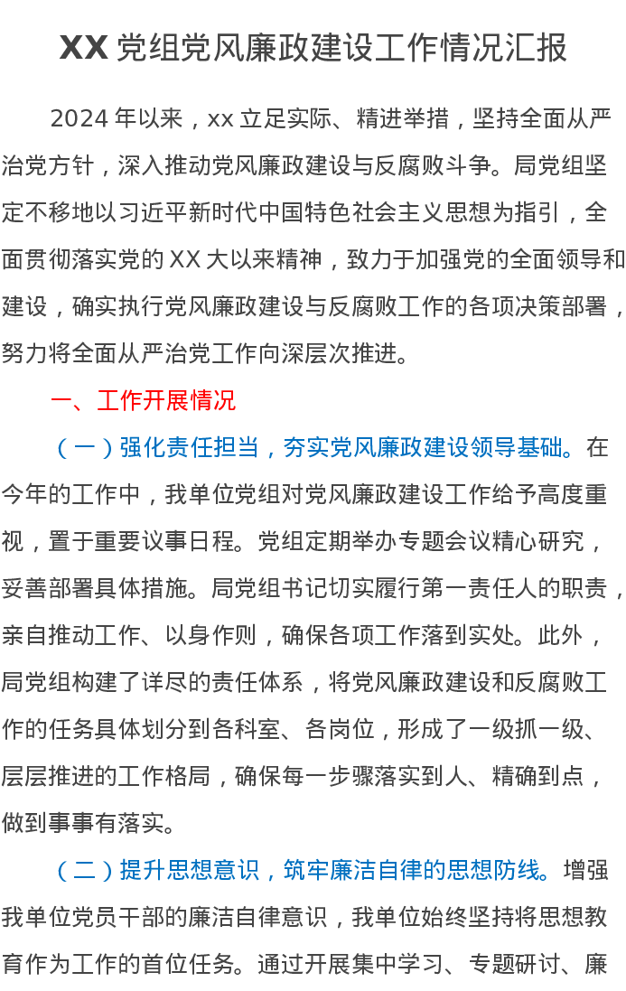 XX党组2024年党风廉政建设工作情况汇报