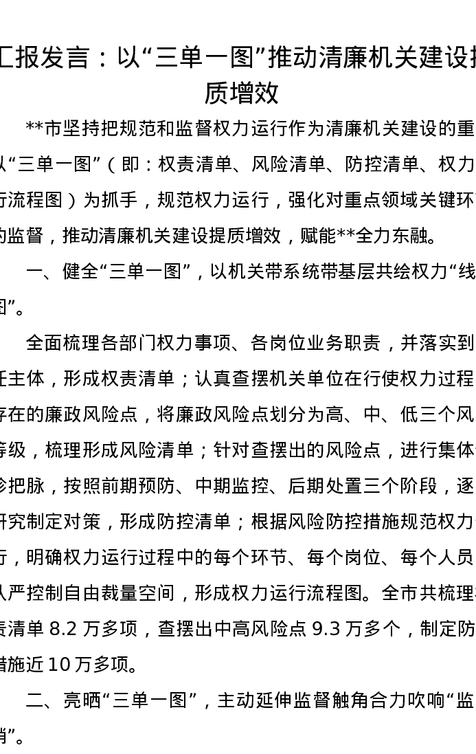 汇报发言:以“三单一图”推动清廉机关建设提质增效