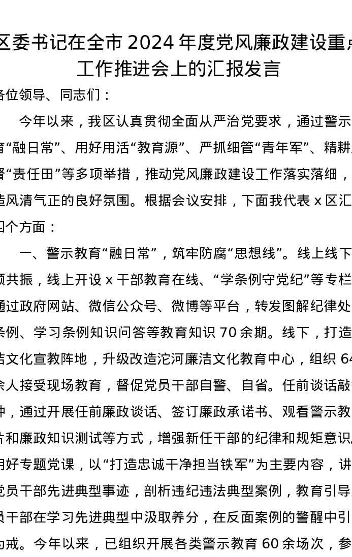 区委书记在全市2024年度党风廉政建设重点工作推进会上的汇报发言