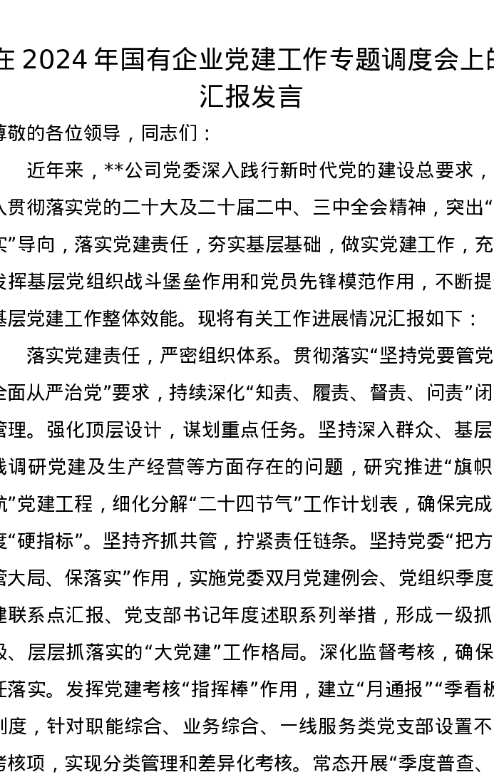在2024年国有企业党建工作专题调度会上的汇报发言