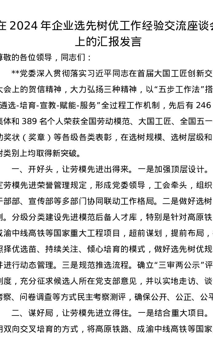在2024年企业选先树优工作经验交流座谈会上的汇报发言