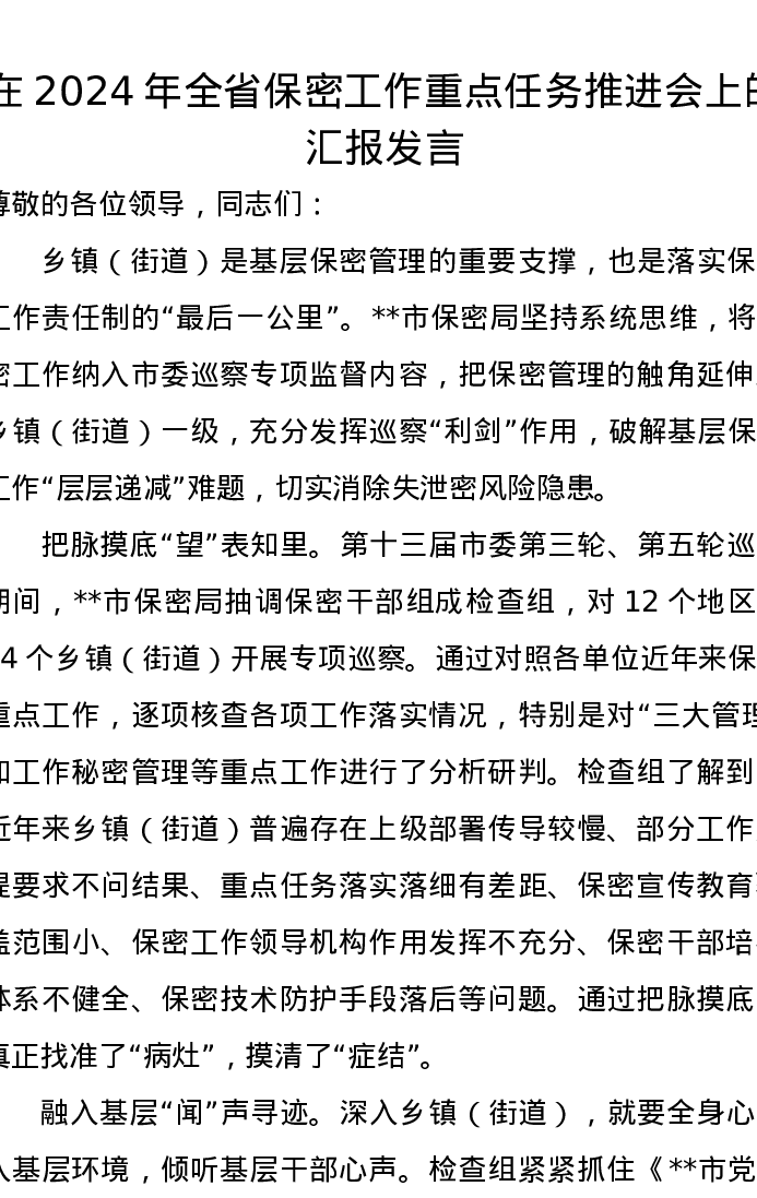 在2024年全省保密工作重点任务推进会上的汇报发言