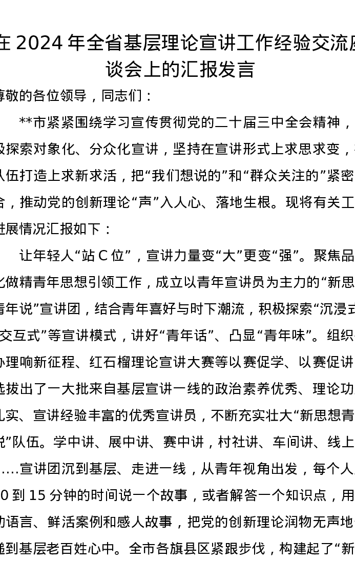 在2024年全省基层理论宣讲工作经验交流座谈会上的汇报发言