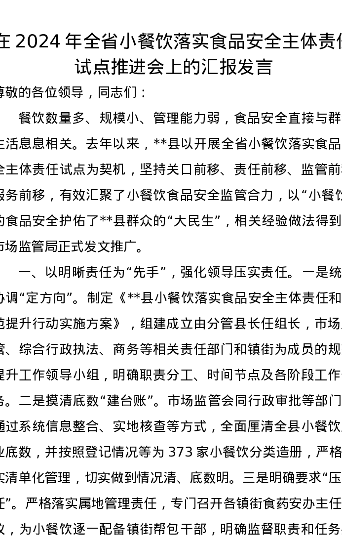 在2024年全省小餐饮落实食品安全主体责任试点推进会上的汇报发言