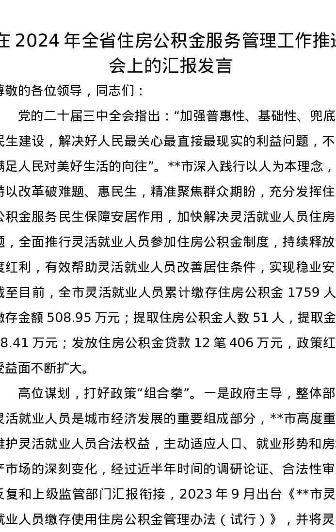 在2024年全省住房公积金服务管理工作推进会上的汇报发言