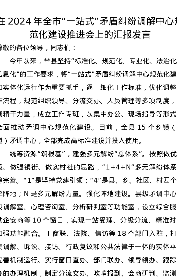 在2024年全市“一站式”矛盾纠纷调解中心规范化建设推进会上的汇报发言