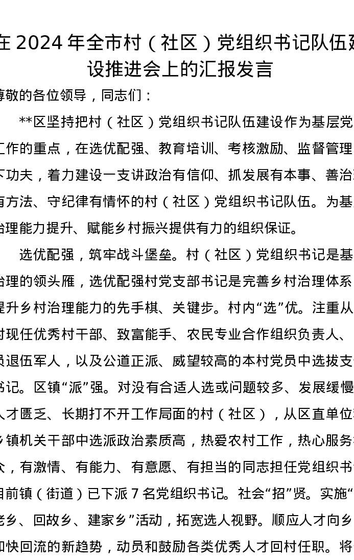 在2024年全市村(社区)党组织书记队伍建设推进会上的汇报发言