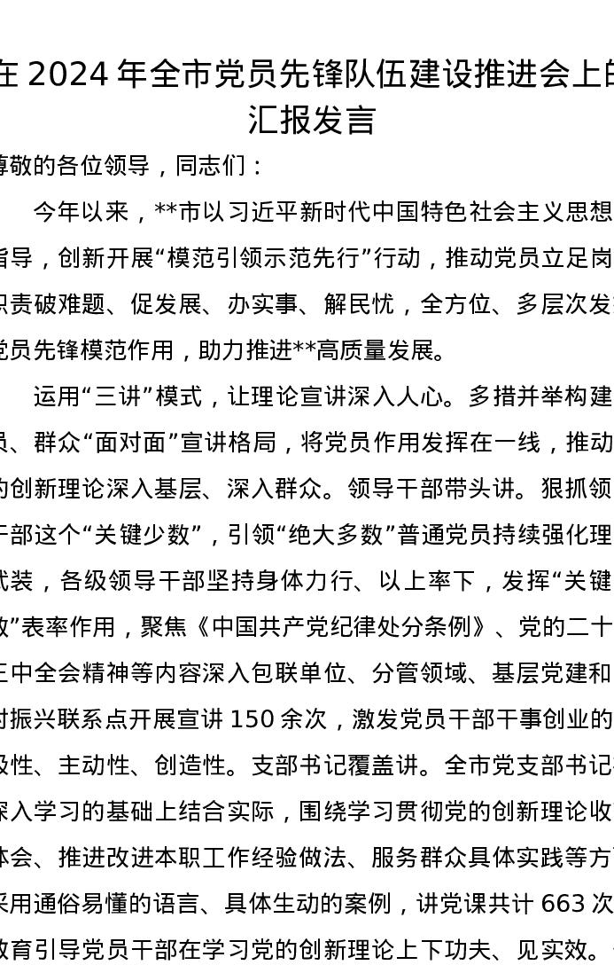 在2024年全市党员先锋队伍建设推进会上的汇报发言