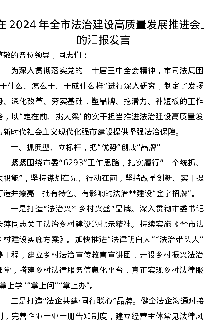 在2024年全市法治建设高质量发展推进会上的汇报发言