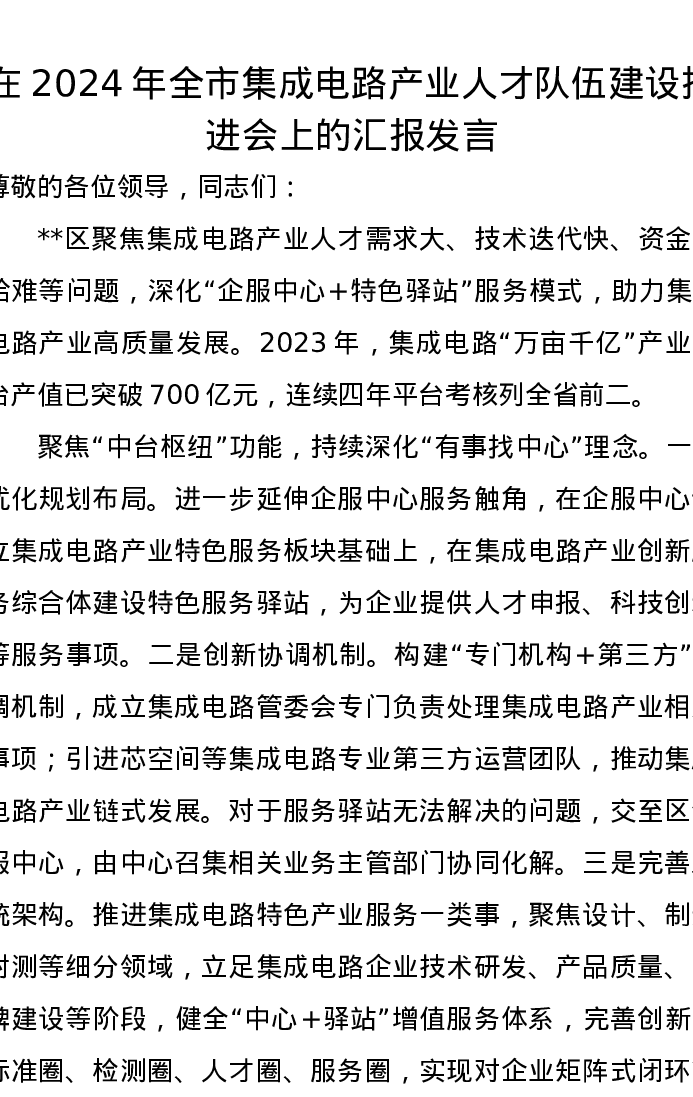 在2024年全市集成电路产业人才队伍建设推进会上的汇报发言