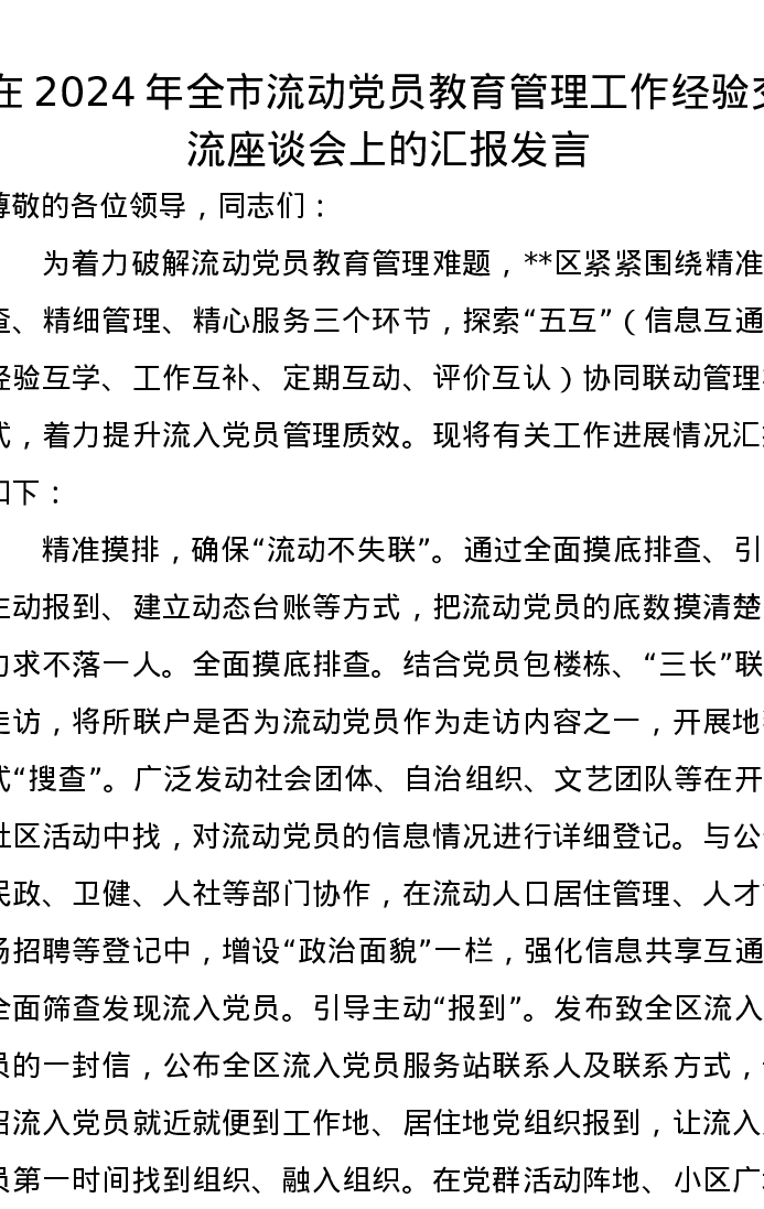 在2024年全市流动党员教育管理工作经验交流座谈会上的汇报发言