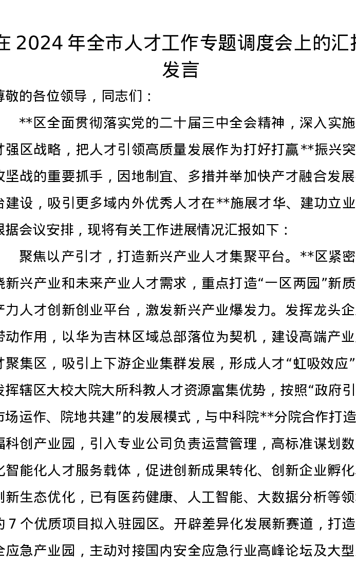 在2024年全市人才工作专题调度会上的汇报发言