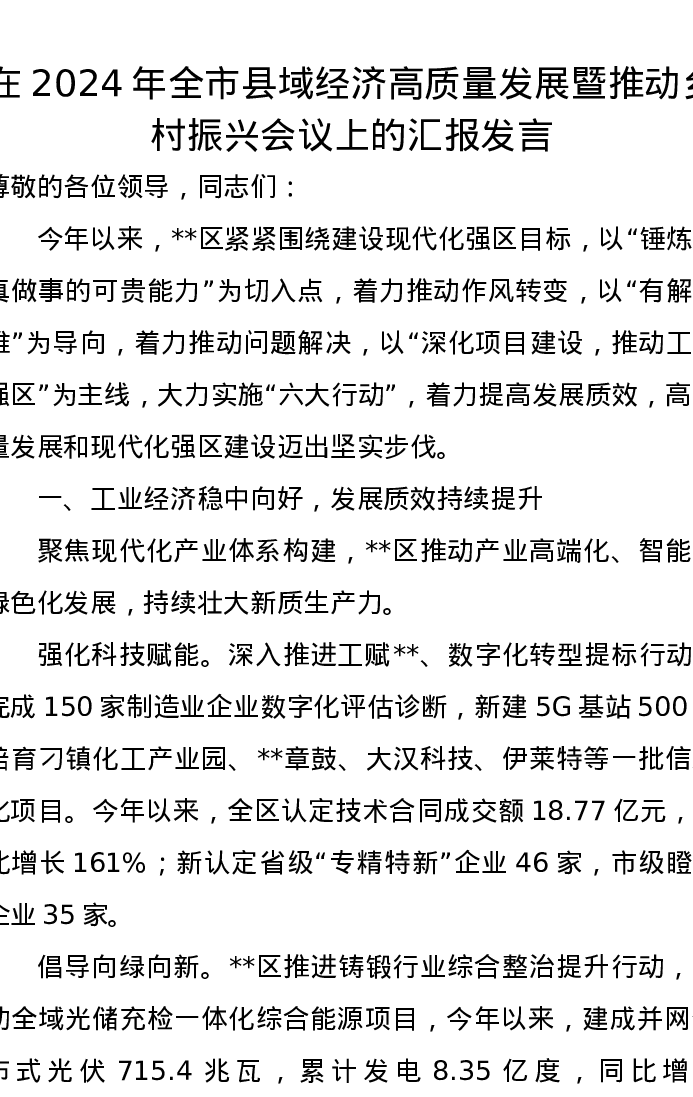在2024年全市县域经济高质量发展暨推动乡村振兴会议上的汇报发言