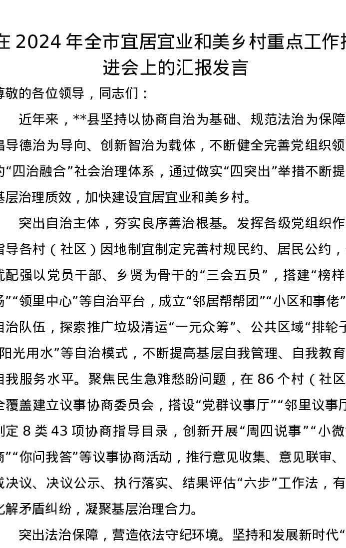 在2024年全市宜居宜业和美乡村重点工作推进会上的汇报发言