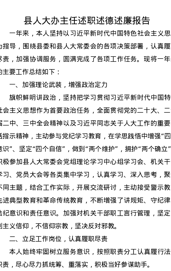 县人大办主任述职述德述廉报告