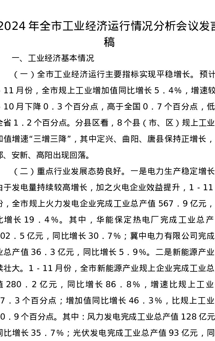 2024年全市工业经济运行情况分析会议发言稿