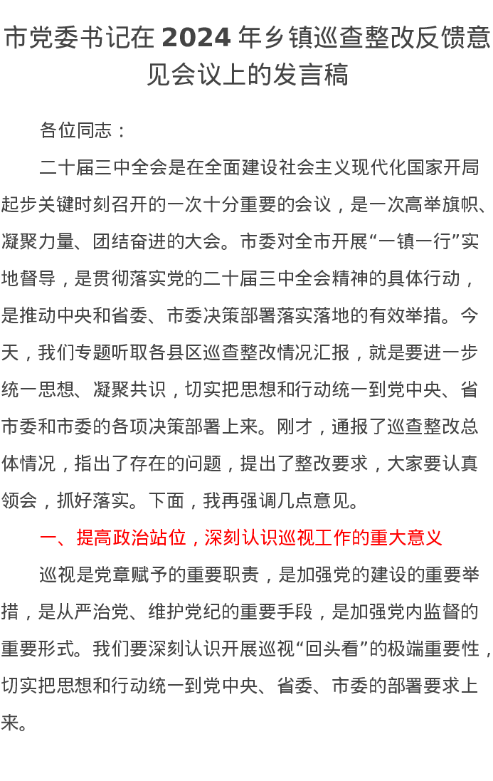 市党委书记在2024年乡镇巡查整改反馈意见会议上的发言稿