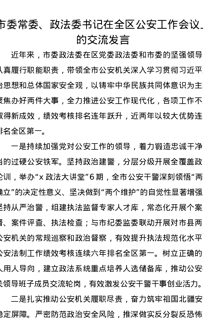 市委常委、政法委书记在全区公安工作会议上的交流发言