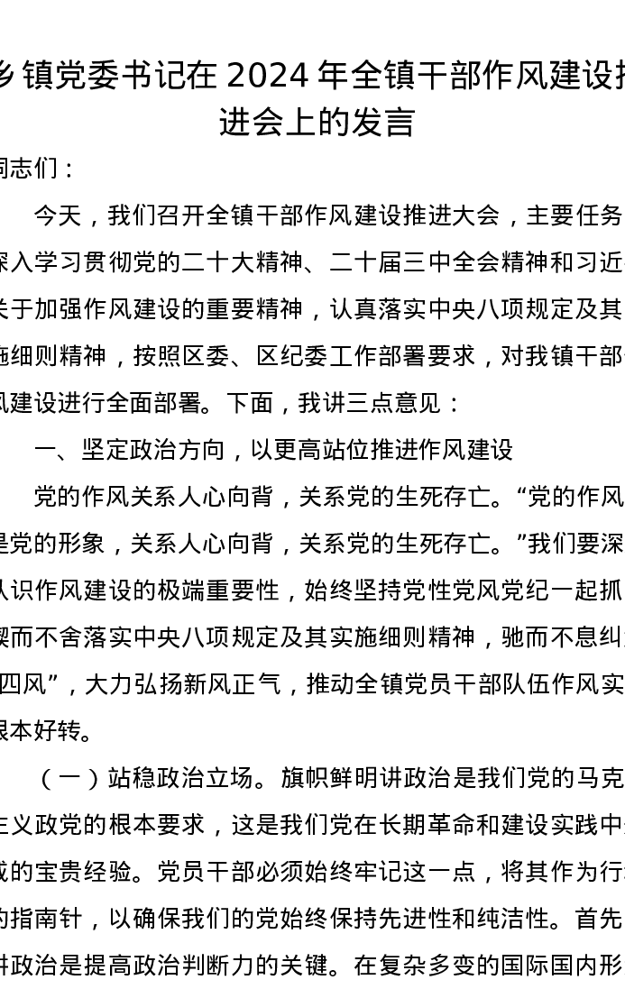 乡镇党委书记在2024年全镇干部作风建设推进会上的发言