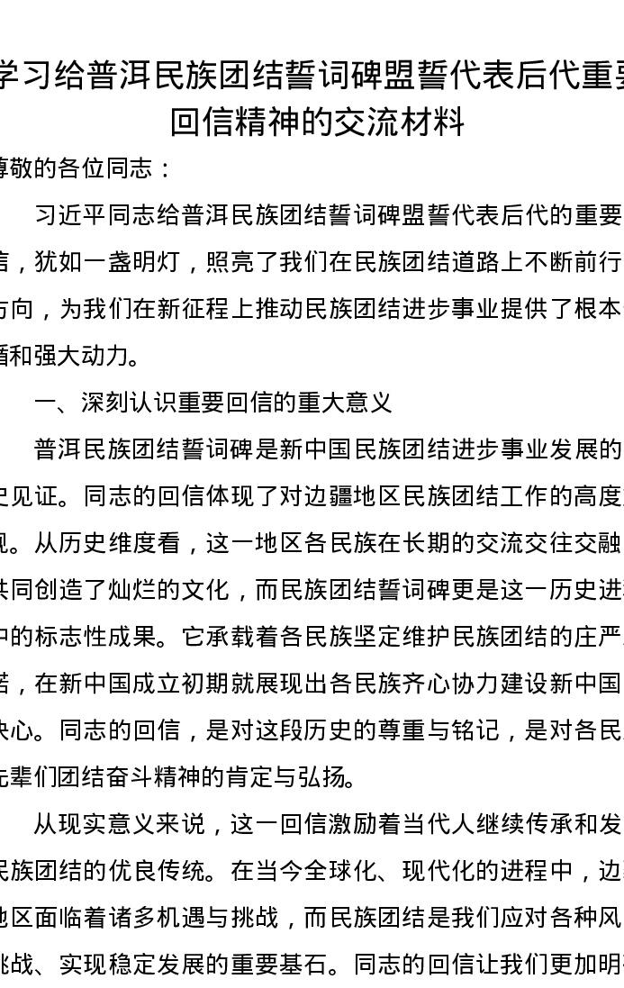 学习给普洱民族团结誓词碑盟誓代表后代重要回信精神的交流发言材料