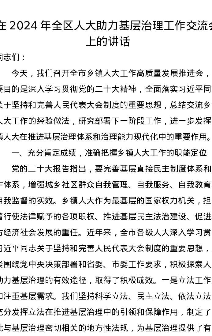 在2024年全区人大助力基层治理工作交流会上的讲话