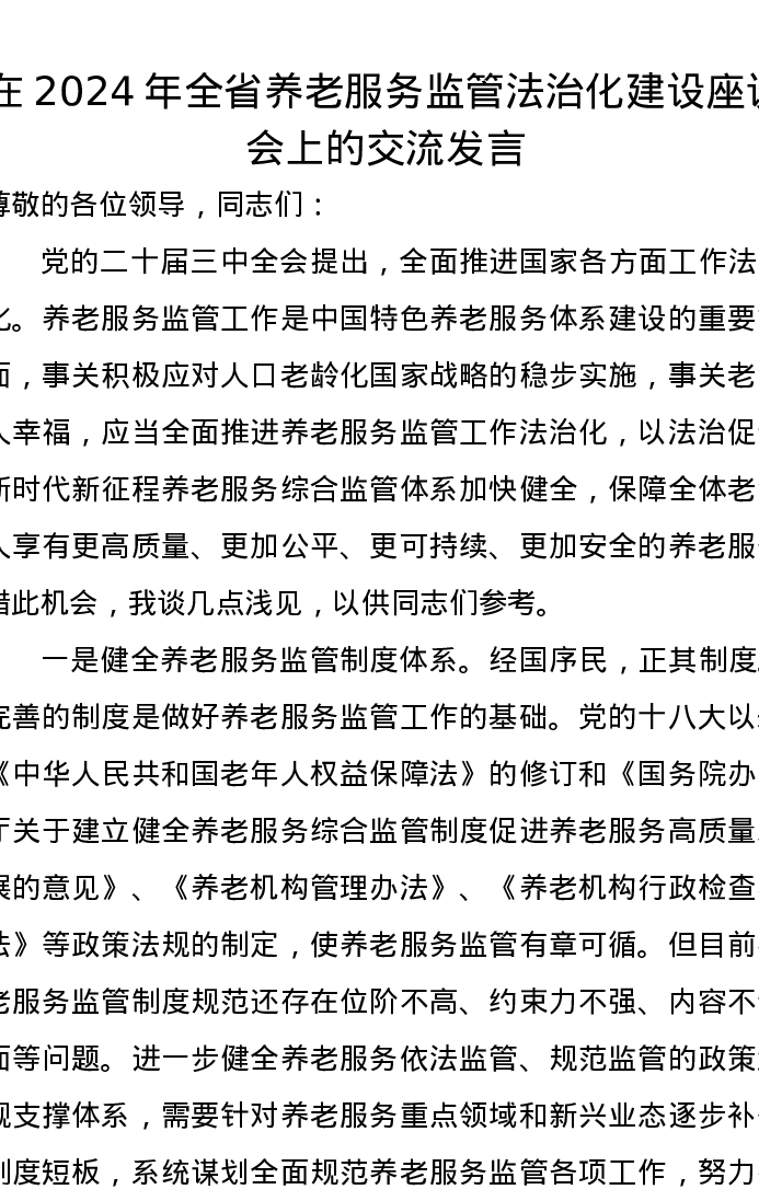 在2024年全省养老服务监管法治化建设座谈会上的交流发言