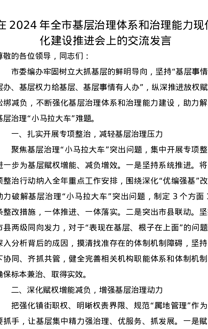 在2024年全市基层治理体系和治理能力现代化建设推进会上的交流发言
