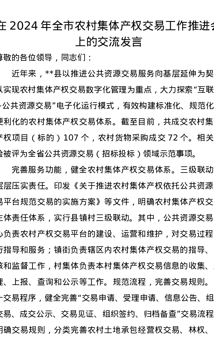 在2024年全市农村集体产权交易工作推进会上的交流发言