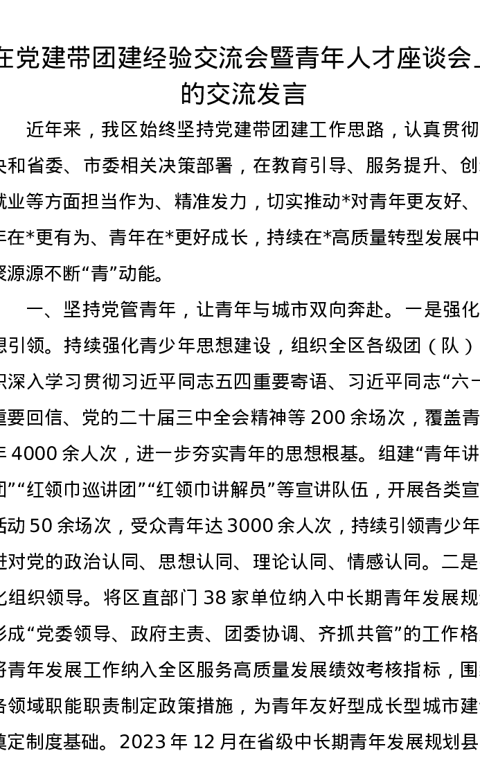 在党建带团建经验交流会暨青年人才座谈会上的交流发言