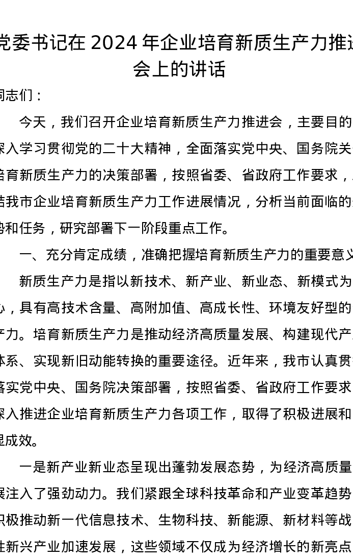 党委书记在2024年企业培育新质生产力推进会上的讲话