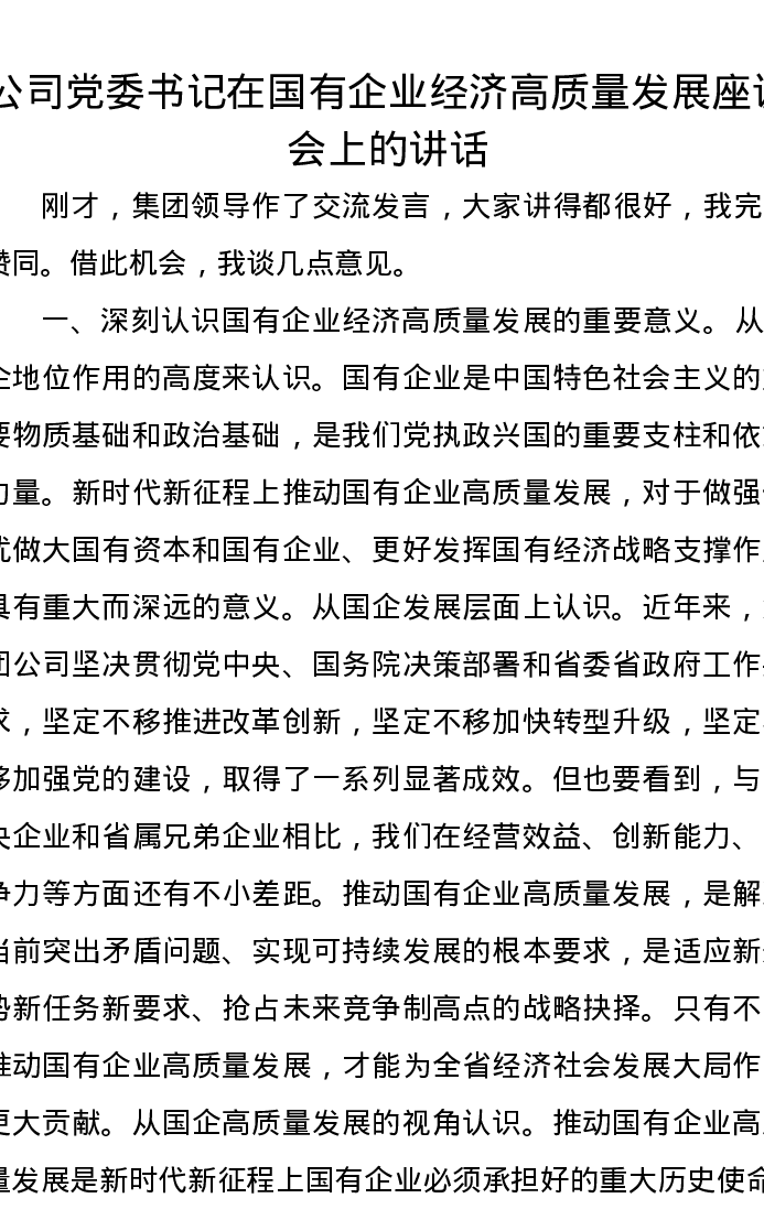 公司党委书记在国有企业经济高质量发展座谈会上的讲话