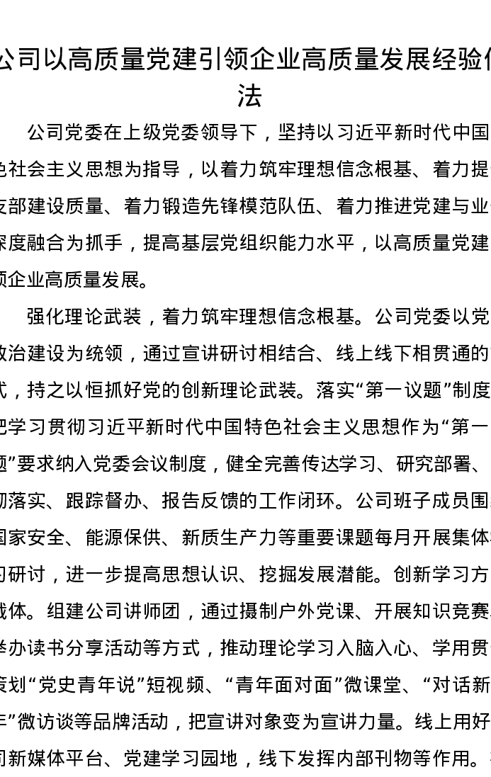 公司以高质量党建引领企业高质量发展经验做法