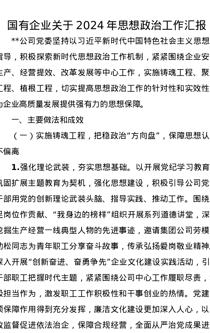 国有企业关于2024年思想政治工作汇报