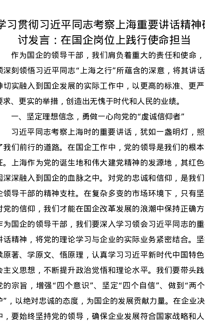 学习贯彻习近平总书记考察上海重要讲话精神研讨发言:在国企岗位上践行使命担当