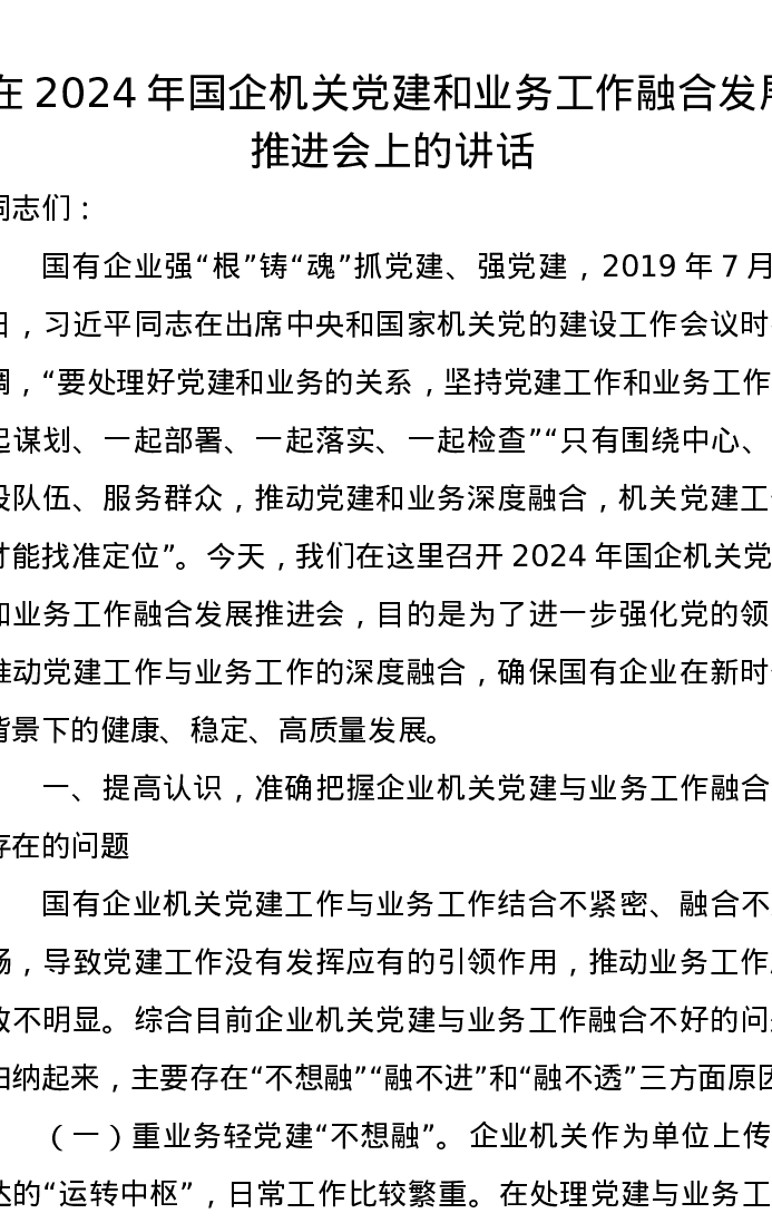 在2024年国企机关党建和业务工作融合发展推进会上的讲话