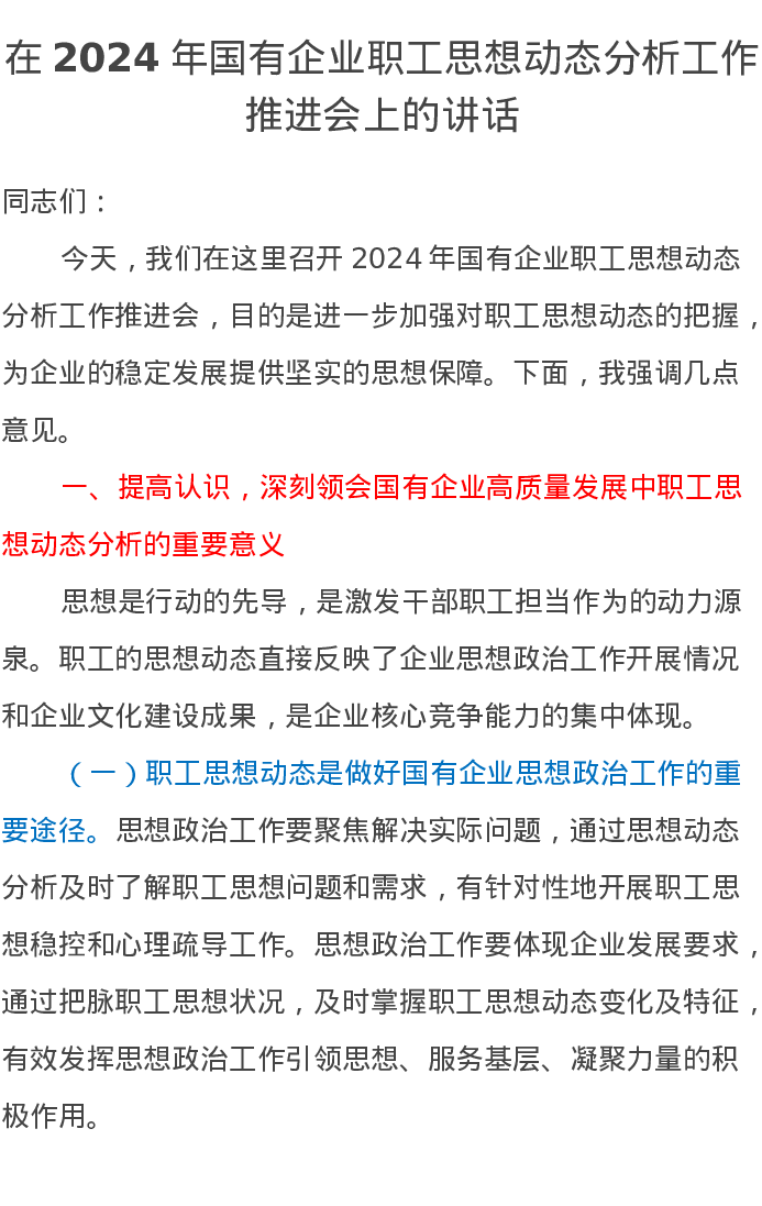 在2024年国有企业职工思想动态分析工作推进会上的讲话