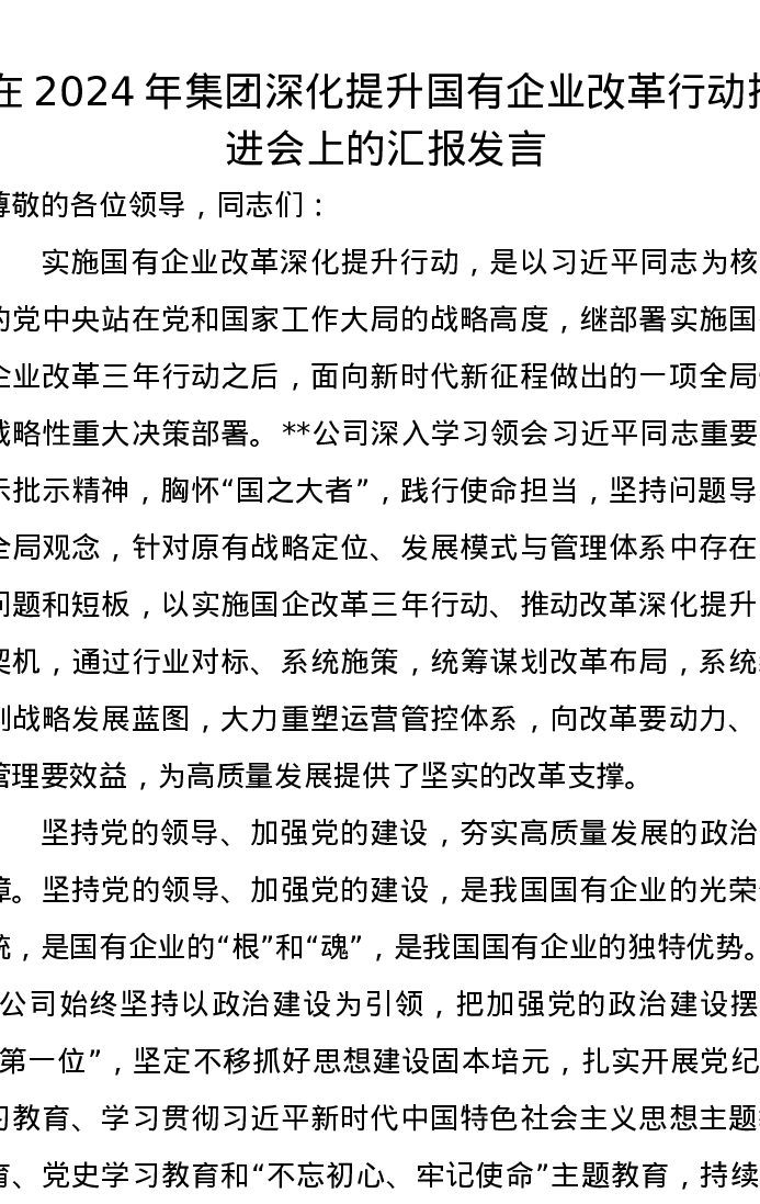 在2024年集团深化提升国有企业改革行动推进会上的汇报发言