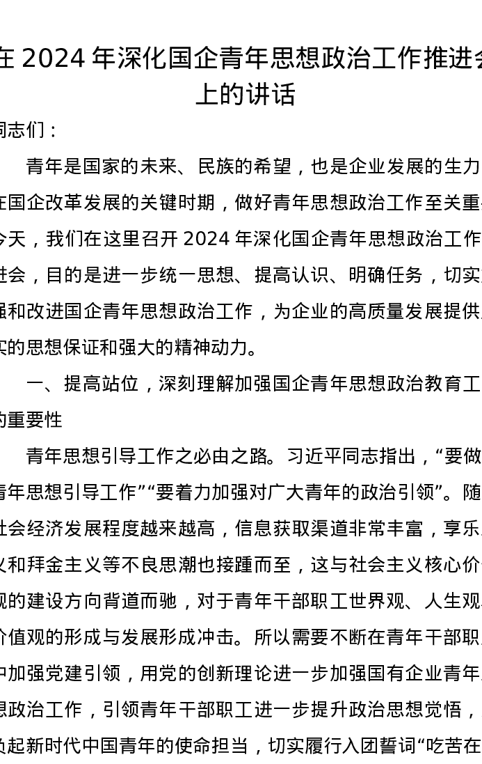 在2024年深化国企青年思想政治工作推进会上的讲话